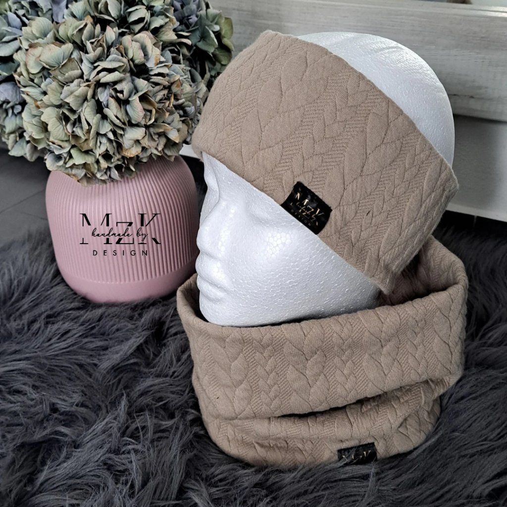 Hřejivá čelenka z béžové pleteniny se vzorem 3D copů.