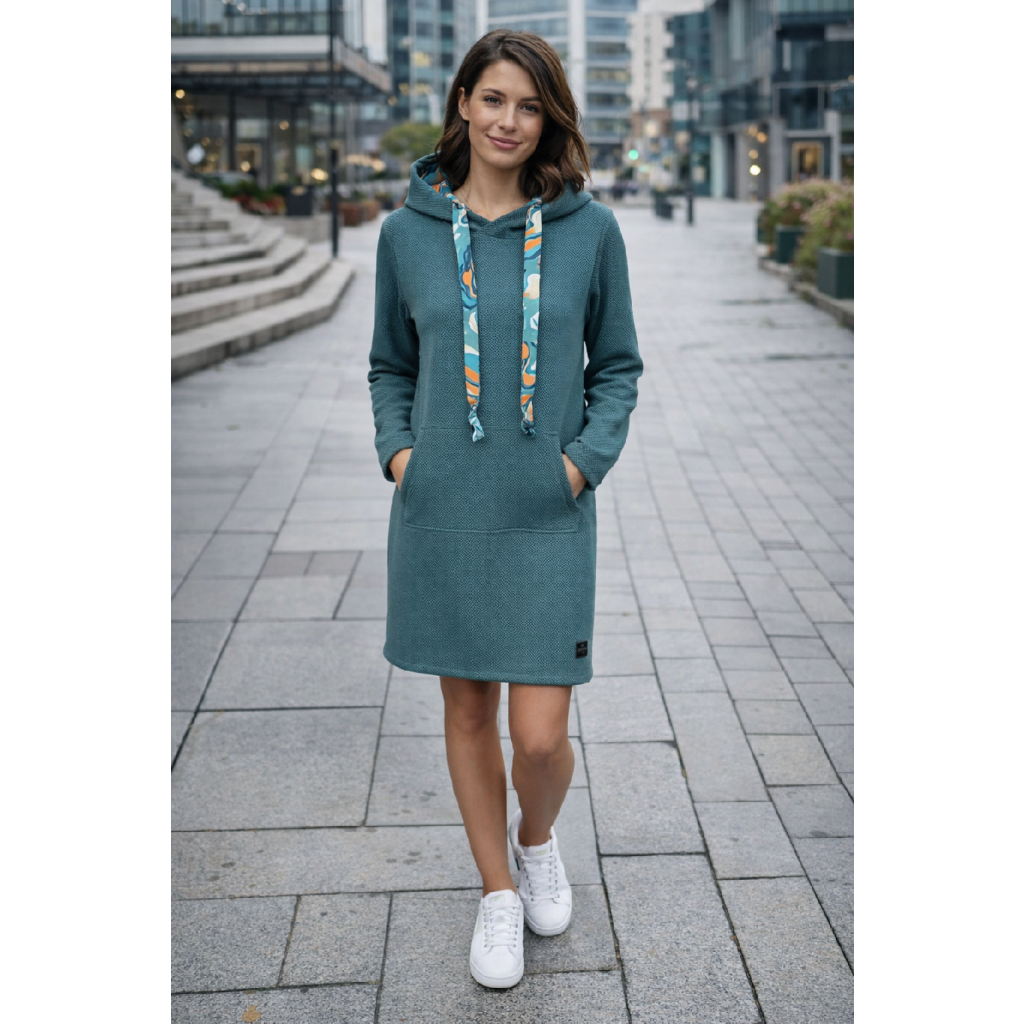 Pohodlné mikinošaty s kapucí a klokankou z elastické pleteniny s krásným 3D efektem na lícové straně.