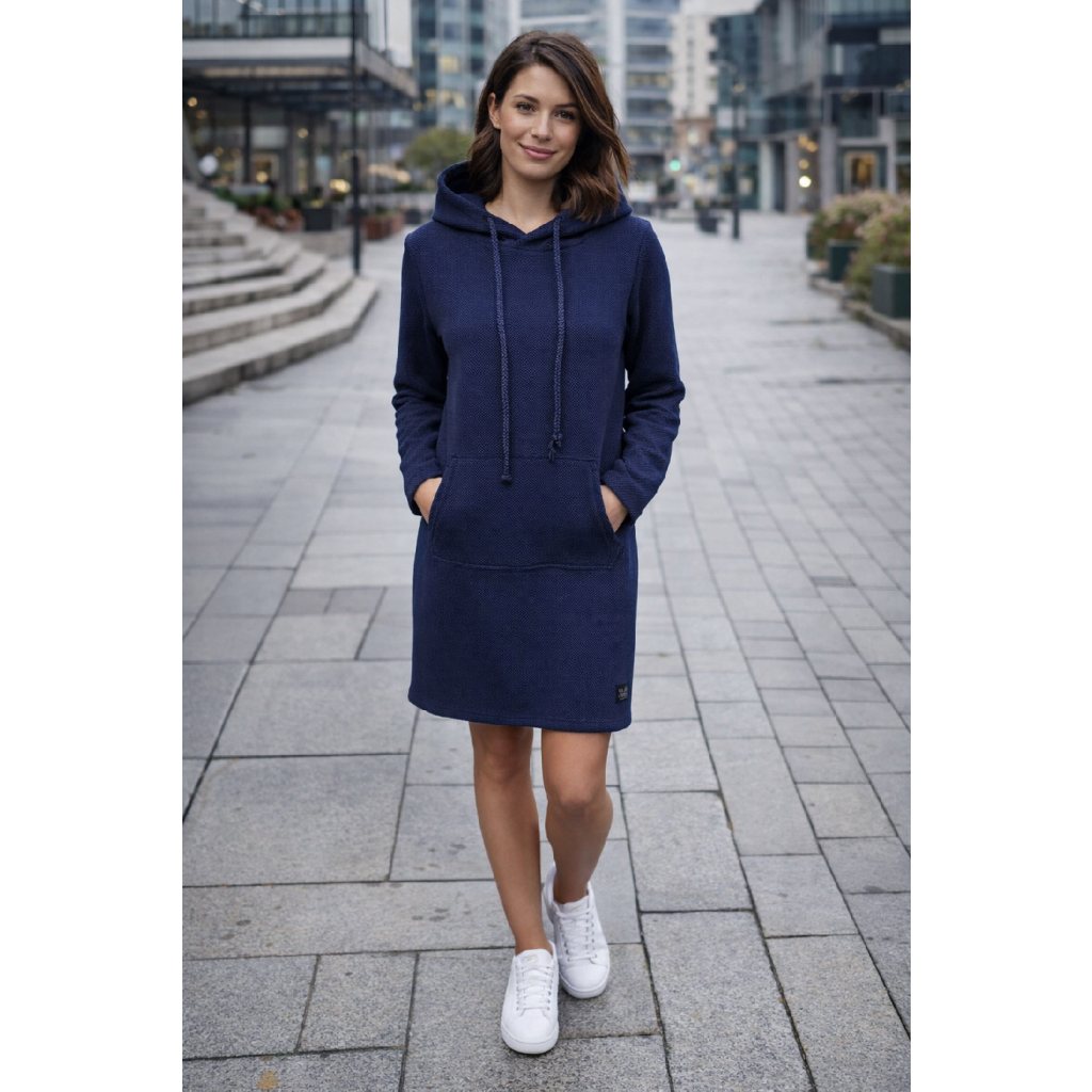 Pohodlné mikinošaty s kapucí a klokankou z elastické pleteniny s krásným 3D efektem na lícové straně.